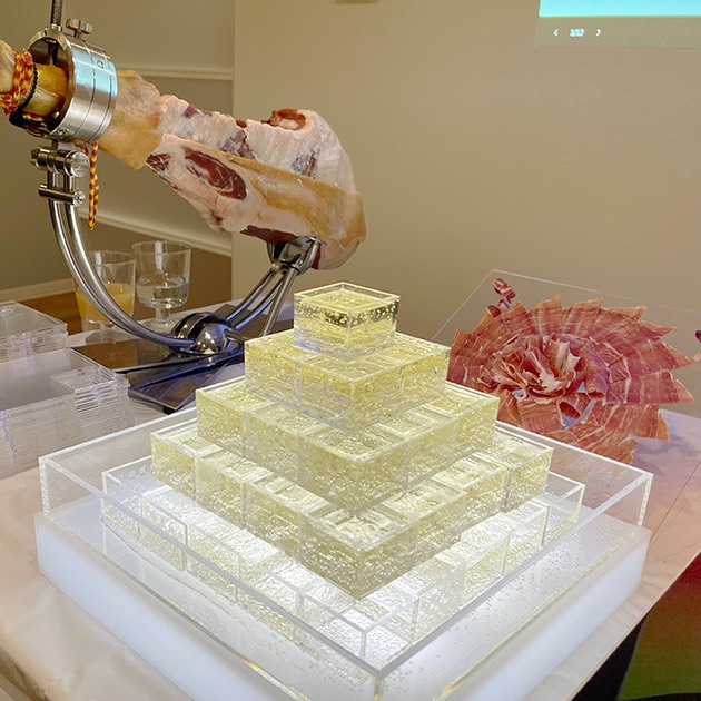 参加された皆様からは、「すごくアットホームで良いパーティーだった」という感想をたくさんいただきました。会場の盛り上がりを象徴していたのが、友成工芸特製の「アクリル枡 mas/masの升タワー」です。透明度が高く美しいアクリルで作られた枡を積み上げ、そこへスパークリングワインを注ぐ演出を行いました。これには「ますますの発展」という願いも込められています。キラキラと輝くタワーを囲んでの乾杯は、会場が一体となる素晴らしい瞬間でした。