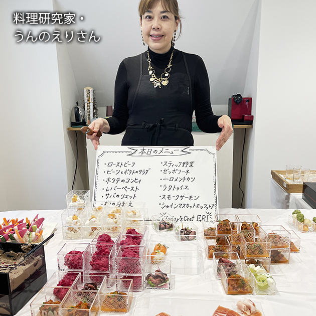 実は、料理の準備はずっと前から始まっていました。50名分以上のの料理を当日すべて用意するのは物理的に不可能です。そこで、お料理教室の経験も豊富なベテランのうんの様に事前に作れるものは作って冷凍し、当日スムーズに提供できる体制を整えていただきました。